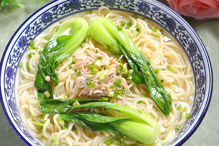 2. 面條150克,鮮姬松茸20克,鮮蟹味菇30克,鮮香菇20克,西藍(lán)花15克,油豆腐15克,酥黃豆10克,小蔥2克