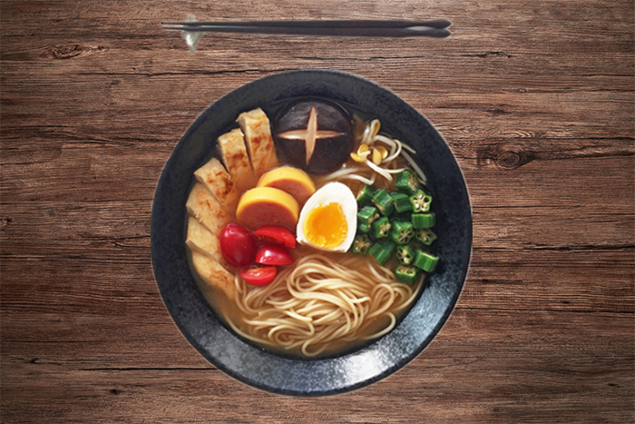 4. 調(diào)好的骨湯400克,加入松茸風(fēng)味底料25克及煮熟食材,一起燒開倒入碗中;